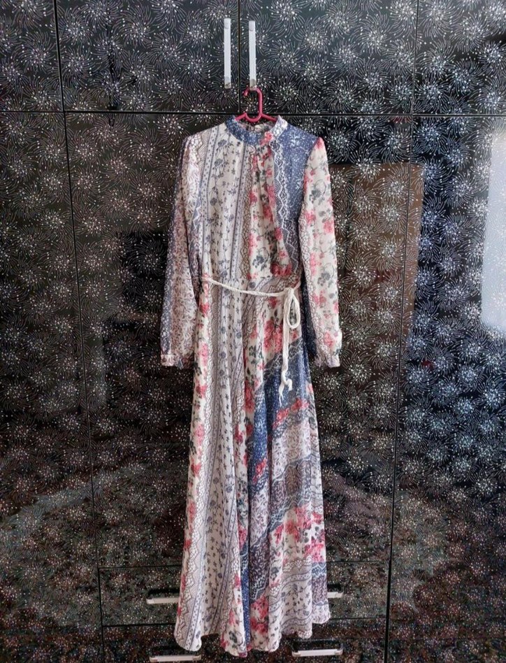 Çok renkli uzun elbise, yüksek yakalı, uzun kollu ve bol kesimdir.