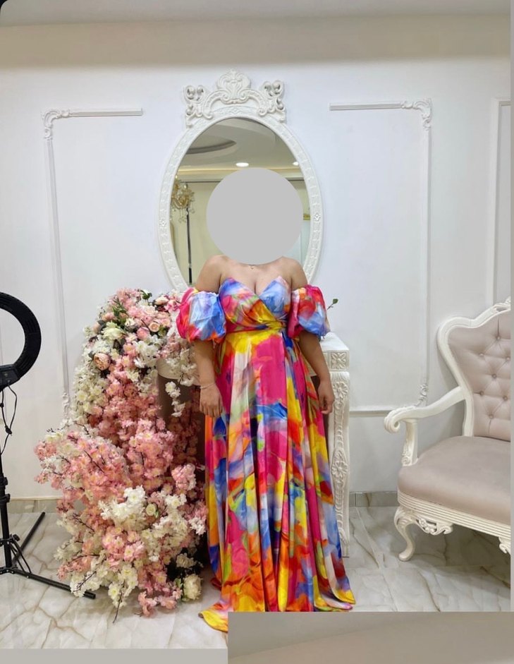 Askılı, uzun ve bol kesim elbise, çok renkli batik desenli ve drapeli tasarıma sahiptir.