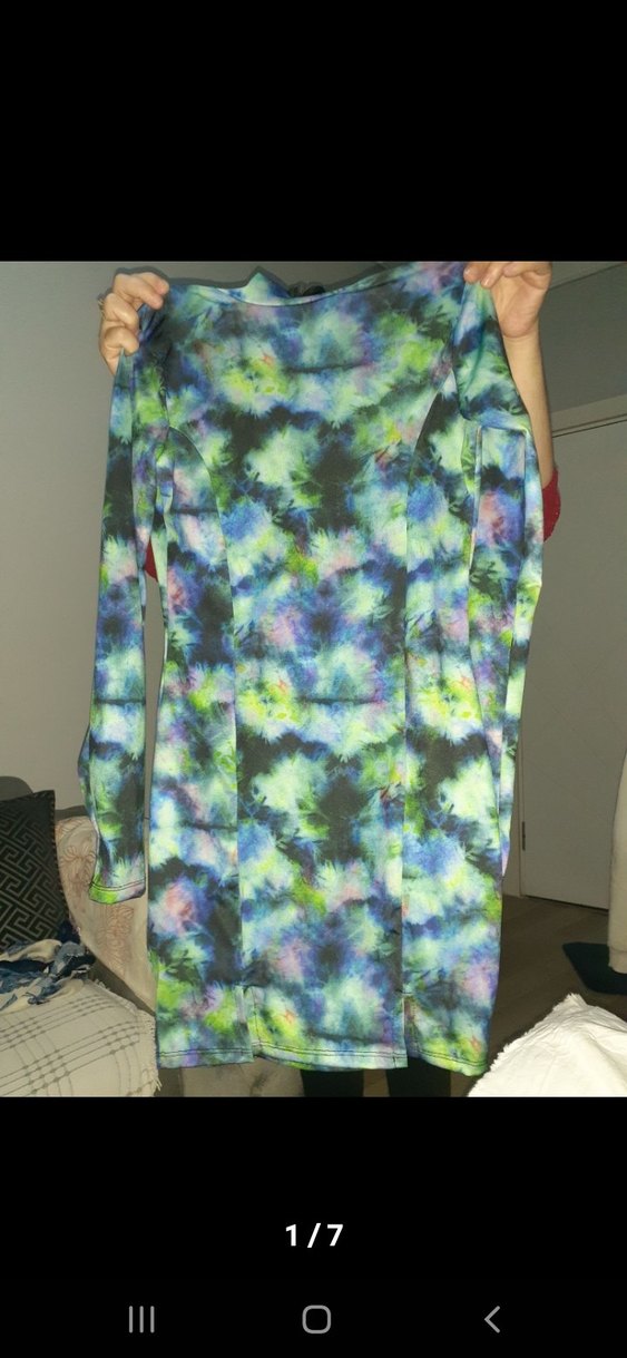 Bu dar kesim batik elbise, çok renkli batik desenli, uzun kollu ve boğazlıdır. Midi boyda, dökümlü ve yumuşak sentetik kumaştan üretilmiştir.
