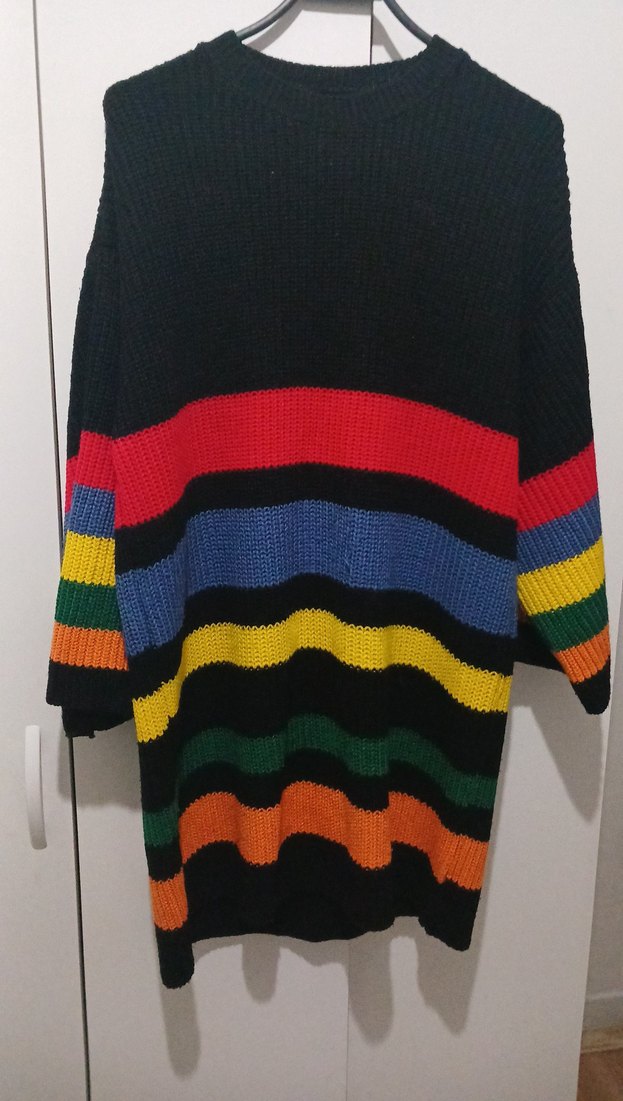 Uzun boy, bol kesim ve boğazlı yakaya sahip örgü kazak. Çok renkli yatay çizgilerle rahat, retro tarzda. Günlük kullanım için uygundur.