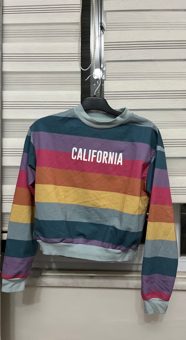 Rahat kesim, uzun kollu ve bisiklet yaka çok renkli çizgili kadın sweatshirtü. "CALIFORNIA" yazılı, yumuşak ve örme dokulu kumaştan üretilmiştir.