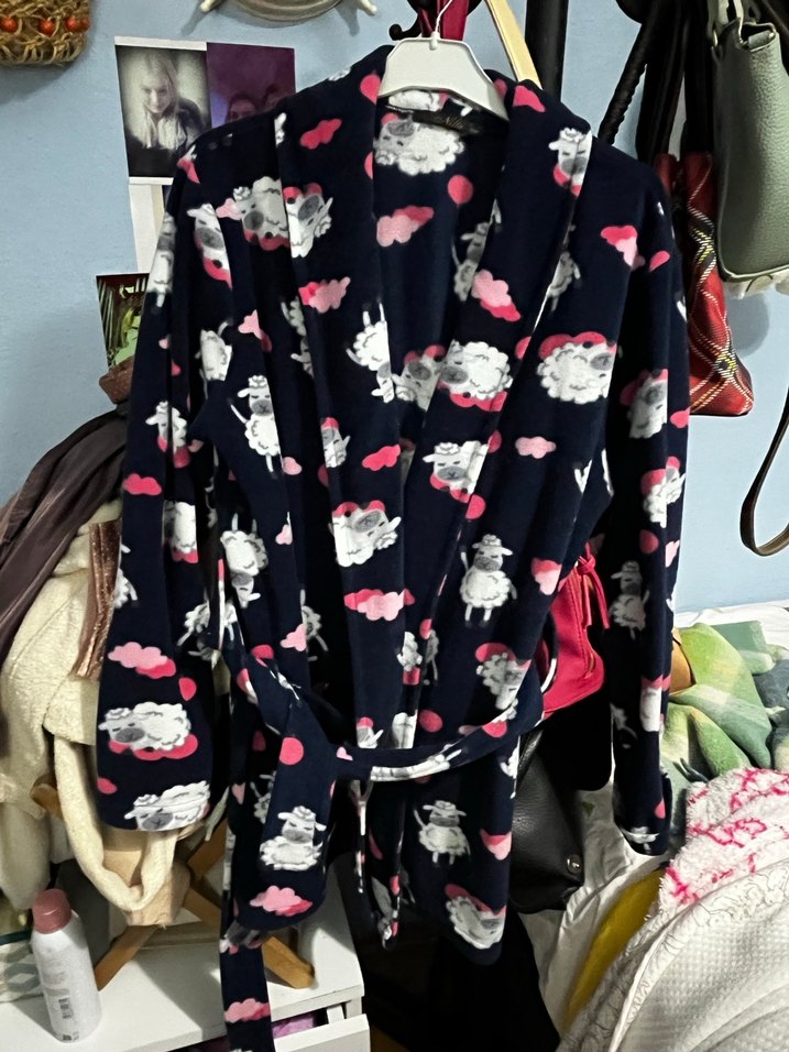 Uzun kollu, bol kesim ve midi boyda rahat kadın sabahlık. Koyu çok renkli bağlama desenli, sevimli koyun baskılarıyla sokak stiline uygun.