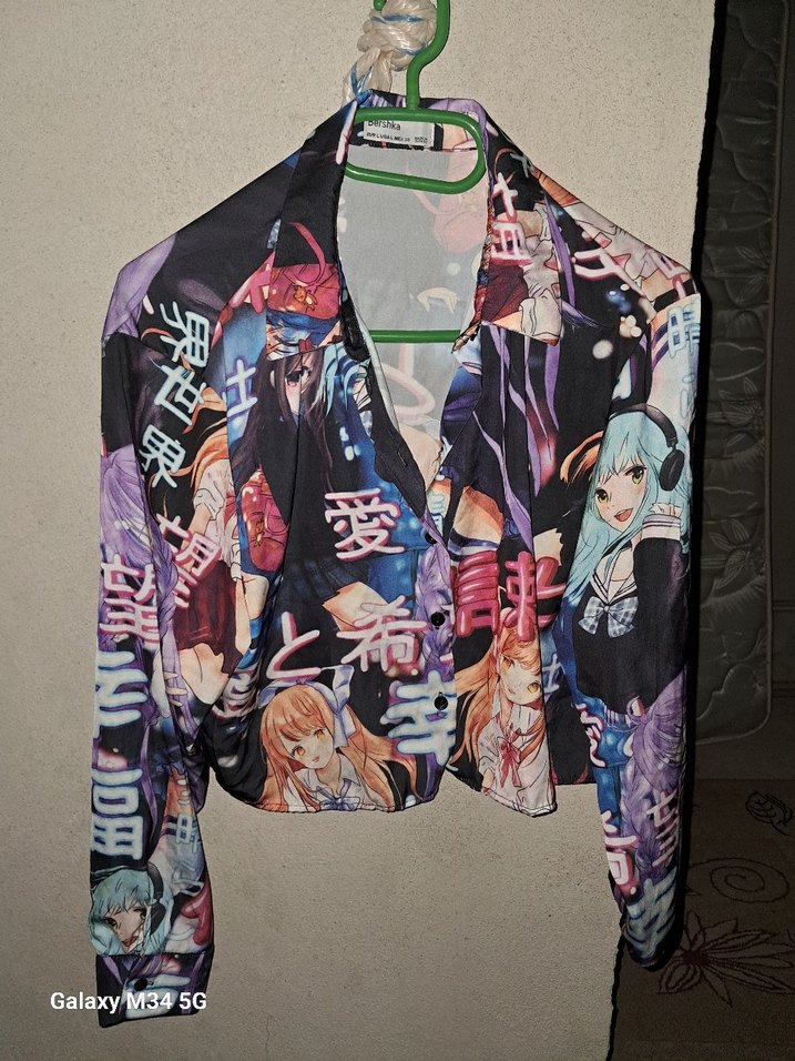 Pop kültür ve anime desenli, çok renkli, kol düğmeli, yakalı, bol kesim, sentetik kumaştan kadın gömleği. Günlük kullanıma uygun.
