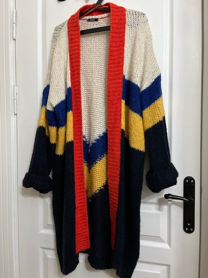 Çok renkli, uzun örgü hırka, bol kesim ve çizgili deseni ile bohem tarzını yansıtır. Notch yakalıdır.