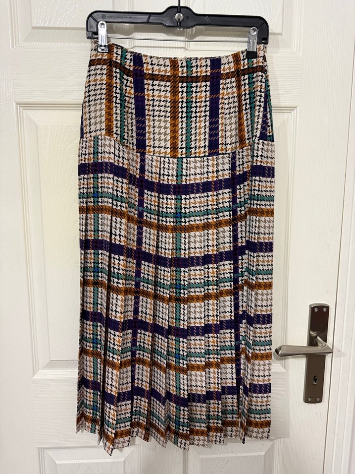 Boy 83cm bel 37cm Bu uzun etek, çok renkli kareli desende piliseli tasarıma sahiptir. Tekstil malzemeden yapılmış, ofis kullanımı için uygun, vintage ve bohem tarzında düzenli kesimdir.