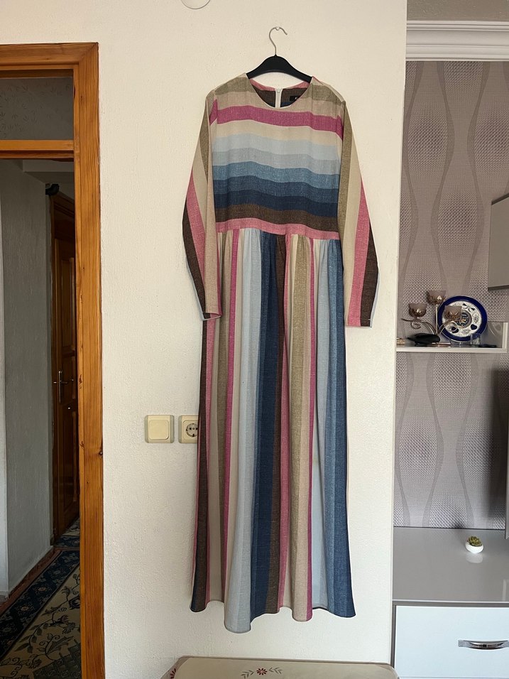 Uzun ve bol kesim elbise, pastel tonlarda çok renkli çizgiler ve pliseli etek detayına sahiptir. Uzun kollu ve kayık yaka tasarımlıdır.  Tesettür elbise Günlük kullanıma uygun kolay kombinlenebilir