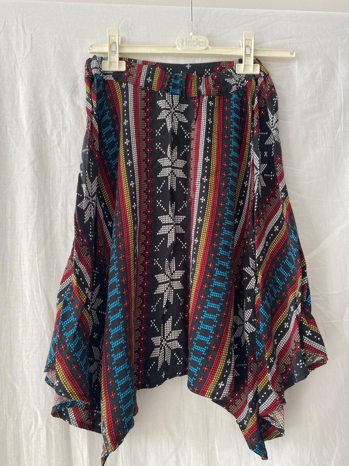 Salaş tarzda, çok renkli tie-dye desenli, uzun ve salaş kesim tekstil etek. Drapeli yapısıyla rahat ve günlük kullanıma uygun. streetbox