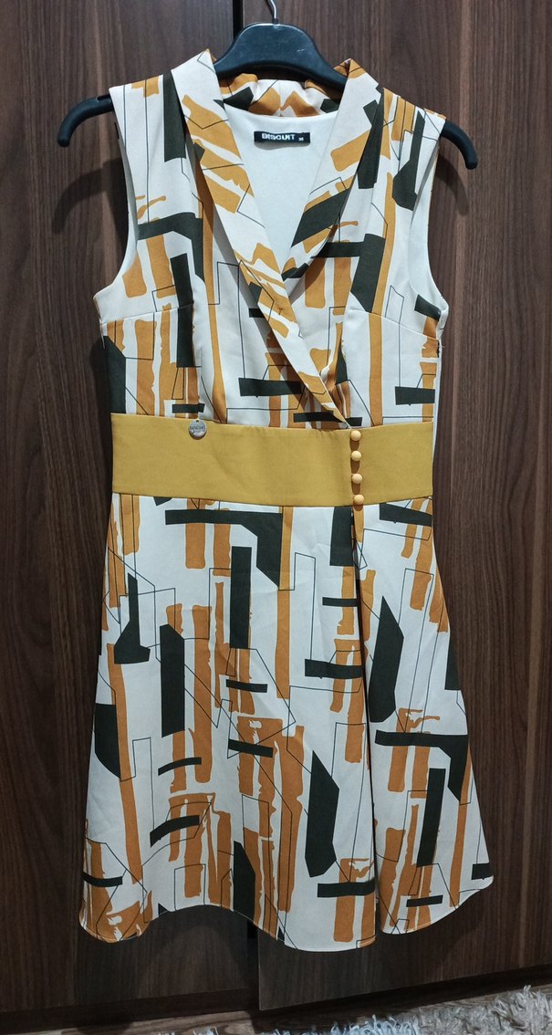 V yaka, kolsuz, kemerli uzun elbise, gri, hardal ve siyah tonlarda geometrik desenli. Sentetik kumaştan, regular fit, sokak stiline uygun.