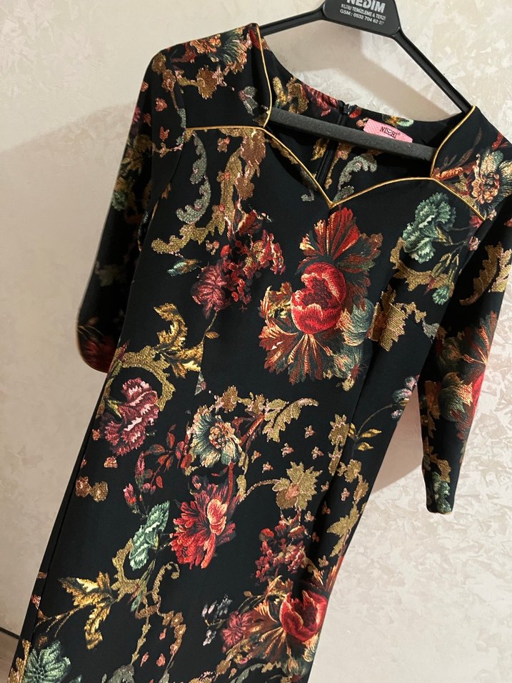 Bu dar kesim kalem elbise, çok renkli vintage çiçek desenine, V yakaya ve uzun kollara sahiptir. Fermuar detaylıdır ve ofis için uygundur.