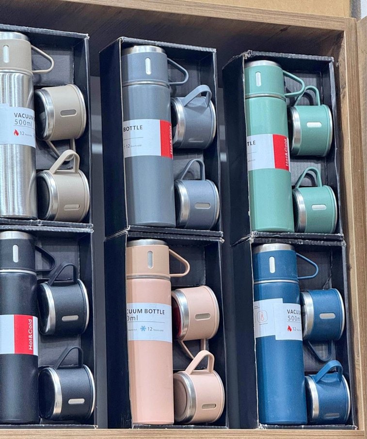 Çok renkli, gri, yeşil, pembe ve mavi tonlarında vakumlu termos ve uyumlu bardak seti. renkleri bulunur. ☕
