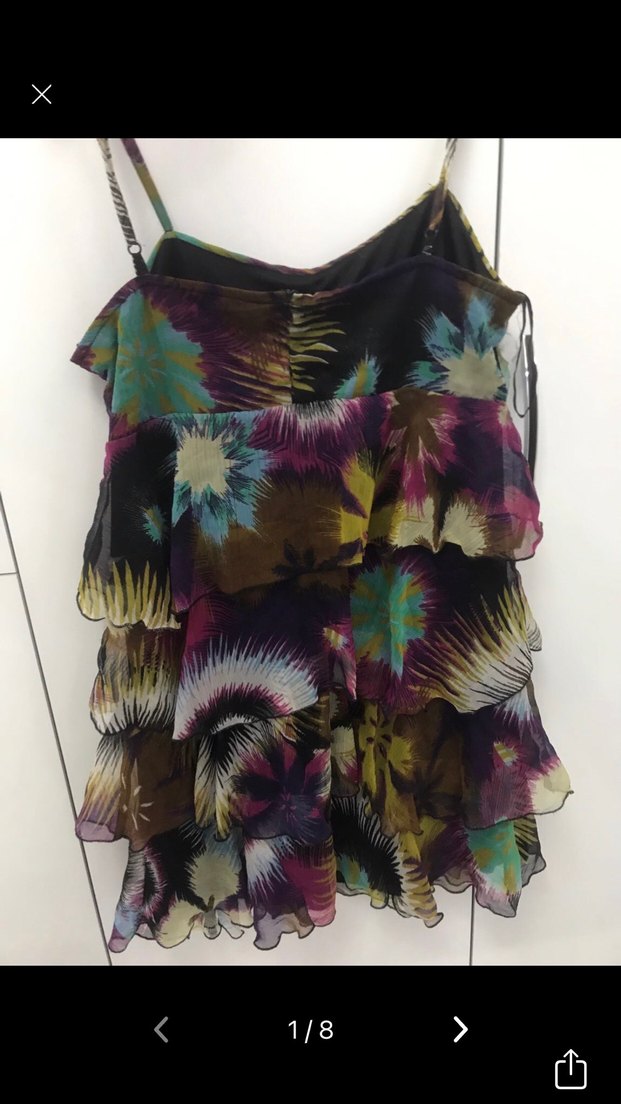 Volanlı katmanları ve koyu batik desenleriyle, askısız, bol kesim mini elbise. Yumuşak sentetik kumaştan, bohem parti tarzı için uygun.
