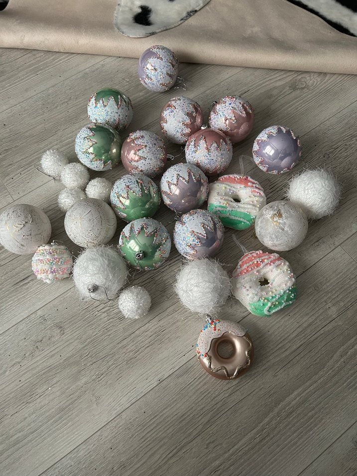 Gri tonlarında çok renkli yılbaşı süsleri seti, dokulu ve simli toplar ile donut şeklinde süsler içerir.