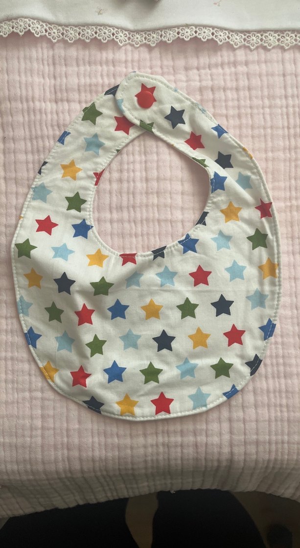 Yumuşak kumaştan yapılmış, çok renkli yıldız desenli bebek önlüğü. Yemek sırasında kıyafetleri korur ve çıtçıt ile kapanır.