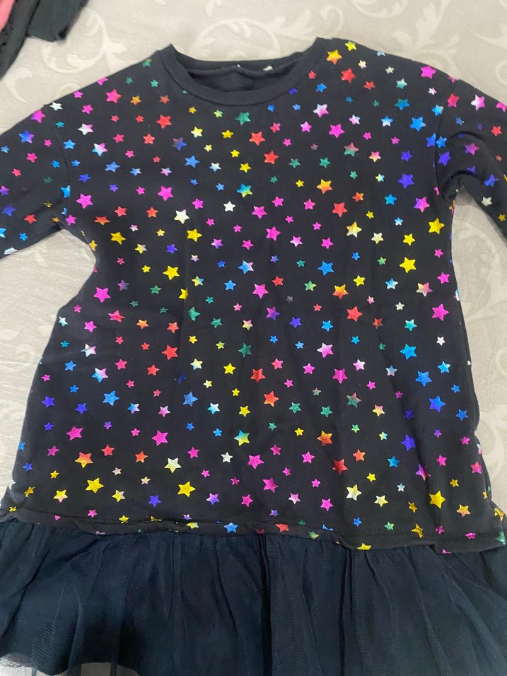 Uzun kollu, yuvarlak yaka ve bol kesim kız elbisesi. Koyu zemin üzerinde çok renkli yıldız deseni ve etek kısmında fırfır detay bulunur. Sentetik yumuşak kumaştan üretilmiştir. ⭐