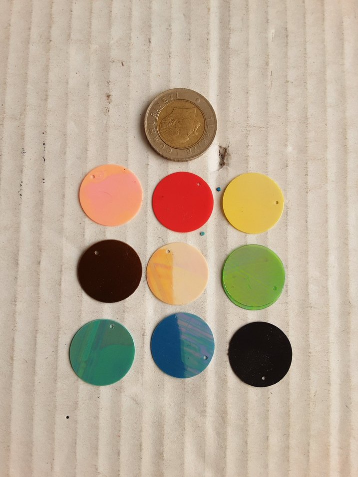 Kırmızı, sarı, yeşil, mavi, siyah, kahverengi ve pastel tonlarda dokuz adet küçük yuvarlak renk örneği, boyut karşılaştırması için bir madeni para ile birlikte yer alıyor.