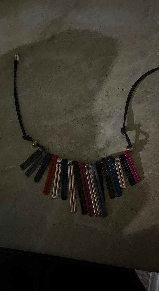 Kadın kolyesi, çok renkli tie-dye desenli, zincir detaylı ve midi uzunluktadır. Günlük kullanıma uygun, çağdaş avant-garde tarzda.