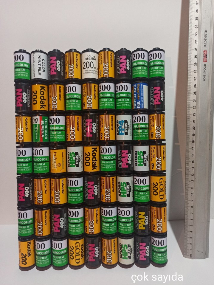 Kodak ve Fujicolor vb markalı, ISO 200 ve 400 seçenekli çok sayıda renkli film rulosu.