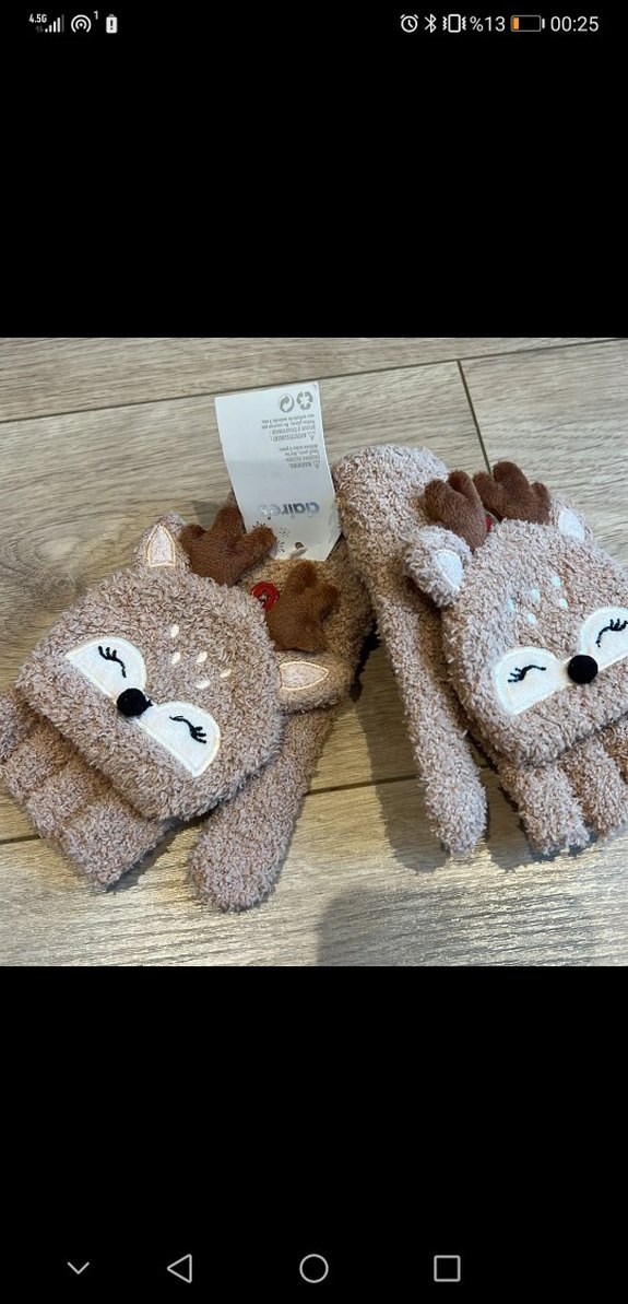 Çocukla için bohem tarzda, nakışlı ve örgü detaylı, yumuşak ve sıcak kumaştan kahverengi eldivenler.