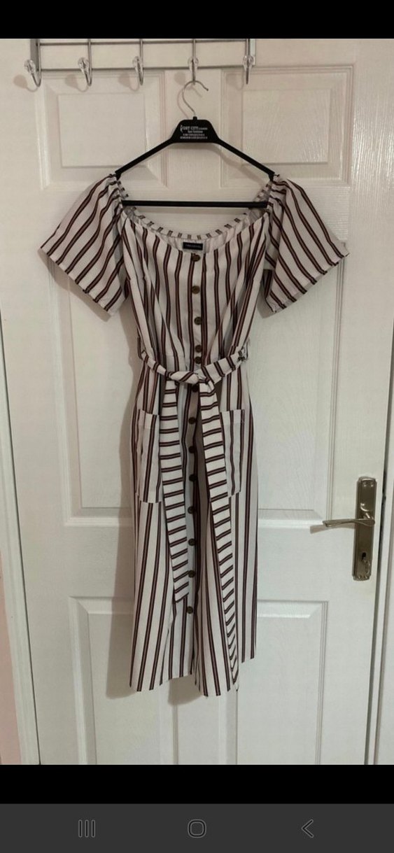 Düğmeli önü ve kayık yaka uzun, bol kesim elbise. Kısa kollu, bele bağlamalı ve kahverengi-gri çizgili bohem tarzda.
