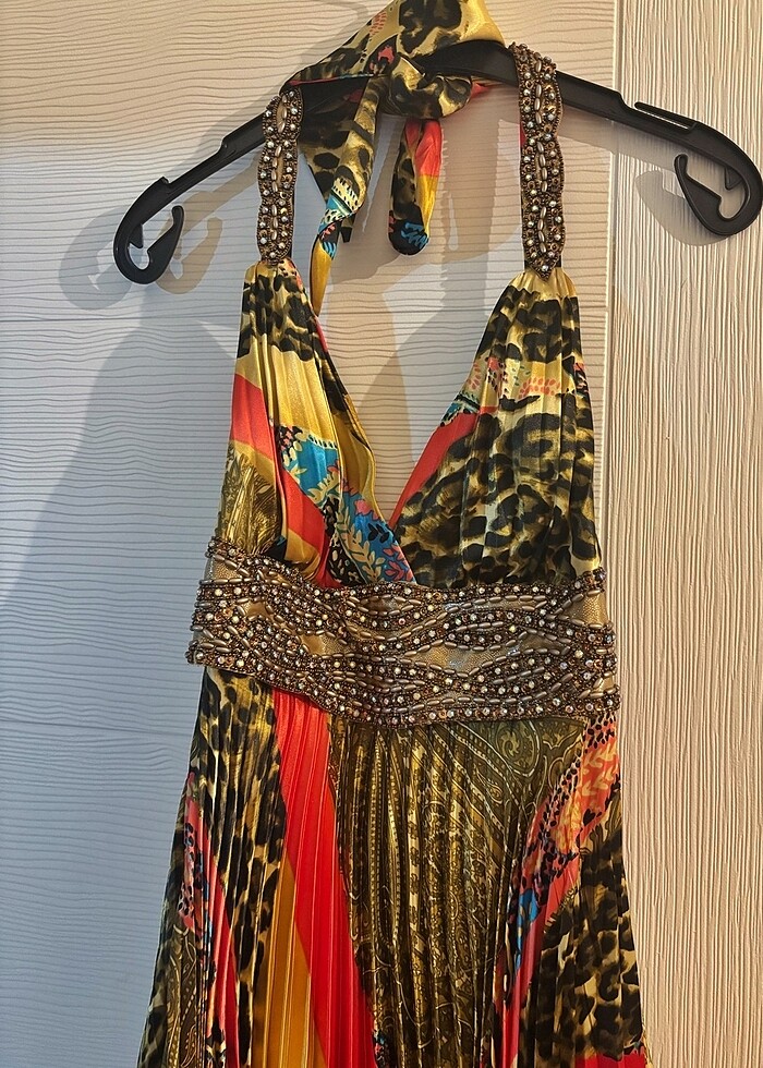 Versace desen ve renkleriyle özel dikim çok şık bir abiye..tam yerinde olan göğüs dekoltesiyle,boyundan bağlamalıdır.bir kez kullanıldı,temiz üründür.