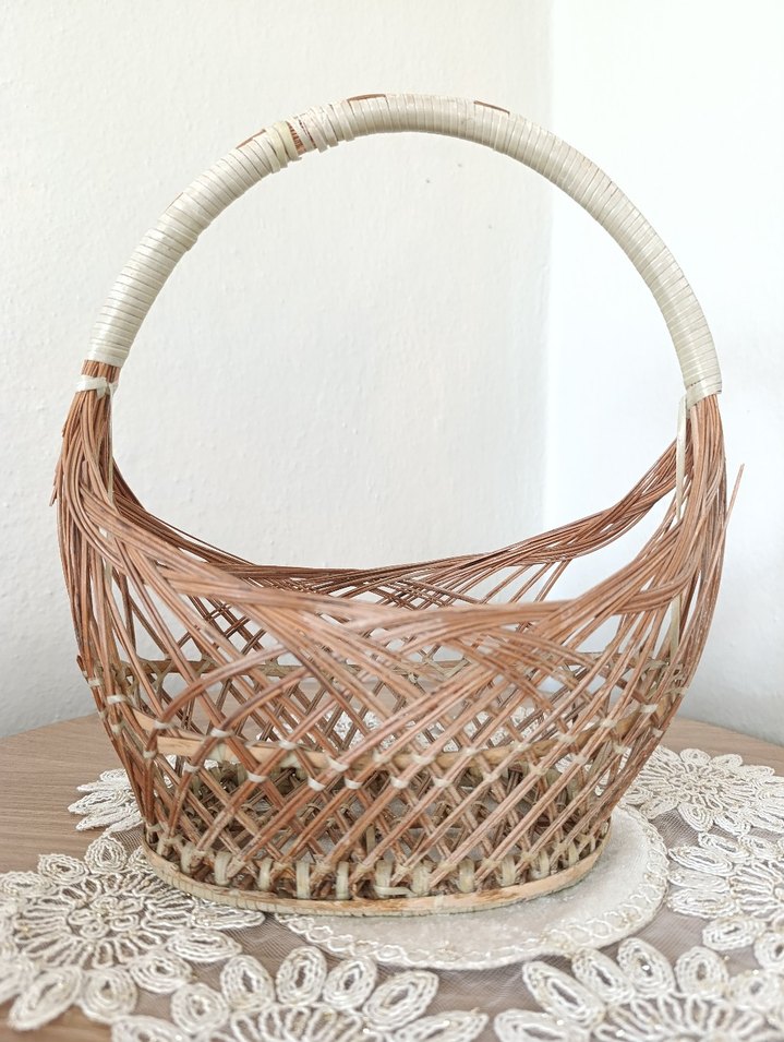 Bej renkte, açık örgü desenli ve açık renk saplı hasır sepet