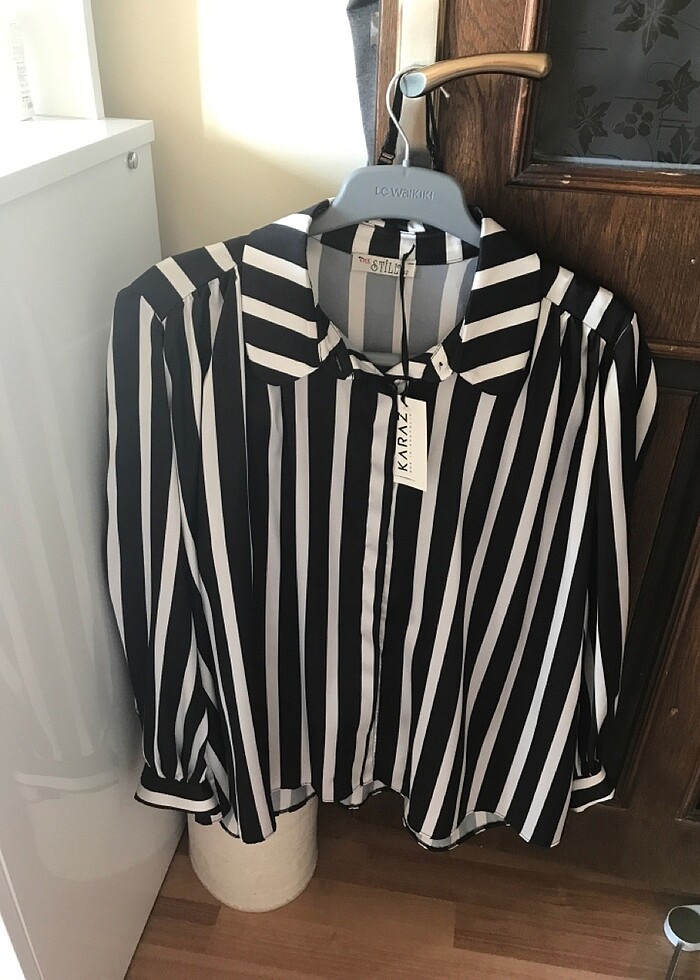 Çok şık gömlek siyah beyaz karpuz kol yeni etiketli boyun fularl
