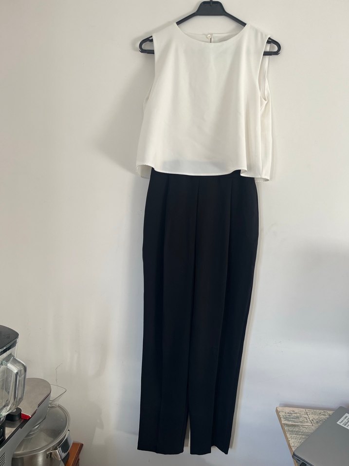 Çok şık İpekyol Tulum Beyaz pilili üst kısmı ve siyah düz pantolonlu, kolsuz tulum. Düz sentetik kumaştan, yuvarlak yaka ve normal kesim. Ofis kullanımı için uygundur.