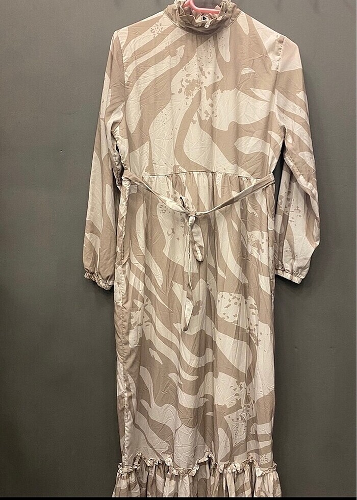 Sütlü kahve kendinden desenli gikarilabilir kemer detayli kollari kastikli etek kisimi firfirli salas kesim elbise 1 kez kullanilmistir sorunsuzdur yeni gibidir marka öne gikmasi adina yazilmistir boy 1.50 iki koltuk arasi 44 cm marka temsili