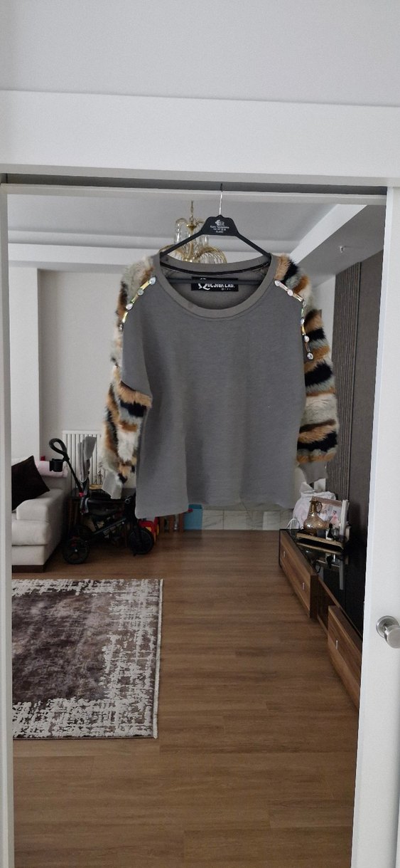 Gri renkli, uzun kollu, kürk detaylı ve batik desenli kısa kesim triko sweatshirt. Salaş kesimi ve yuvarlak yakasıyla rahat sokak stili için uygundur.