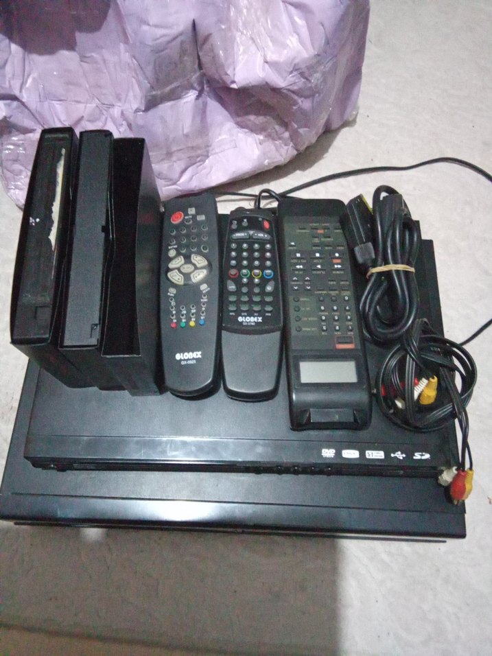 Uydu TV bağlantısı için birden fazla kumanda ve kablo içeren uydu alıcısı seti. Birkaç cihaz ve aksesuar mevcuttur.