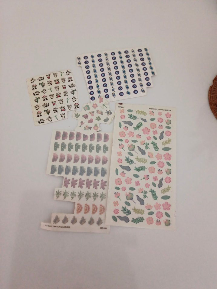çeşitli çiçek ve geometrik desenlere sahip çoklu tırnak süslemeleri. Farklı desenlerin bulunduğu birkaç yaprak içerir.