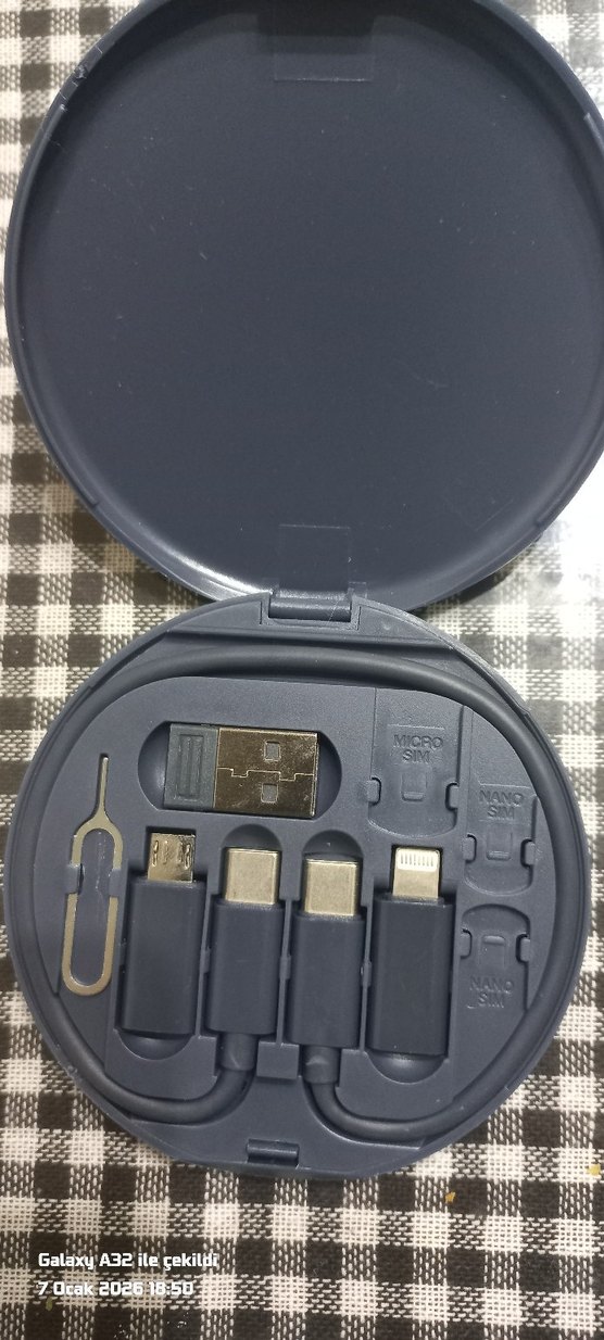 USB, USB-C, Micro USB ve Lightning uçlu gri çoklu telefon şarj seti, SIM kart çıkarıcı ile kompakt ve düzenli.