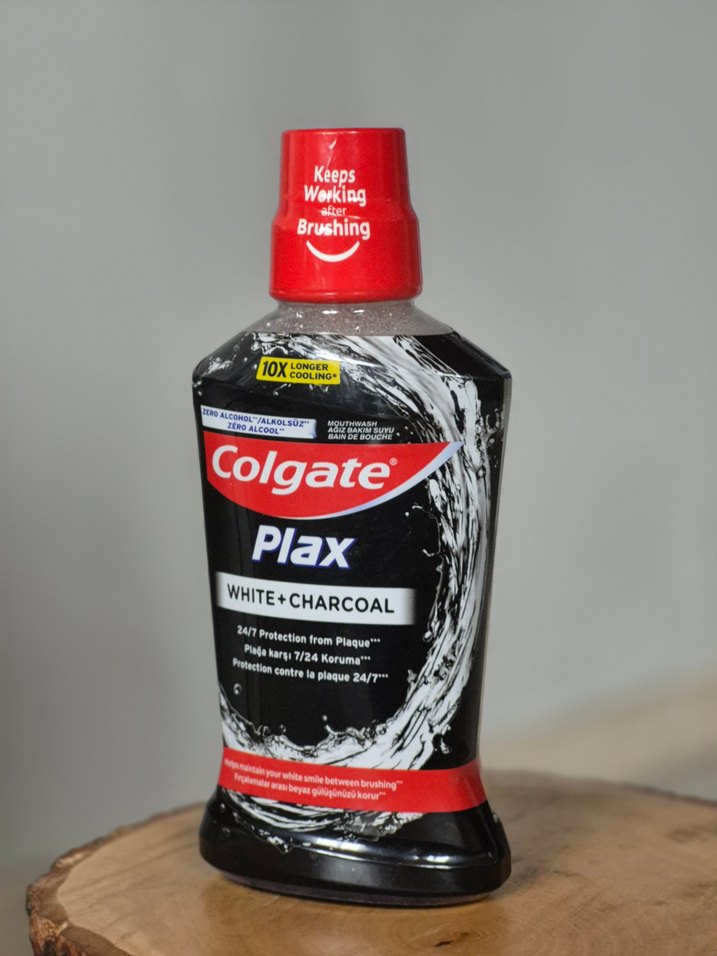 Colgate Plax White+Charcoal ağız gargarası, kömürlü formülüyle 7/24 plak koruması sağlar ve fırçalamadan sonra bile etkisini sürdürür.