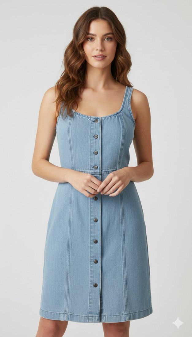 Mavi denim kumaştan yapılmış, düğmeli ve askılı, normal boy midi elbise, rahat ve şık sokak stili için uygundur.