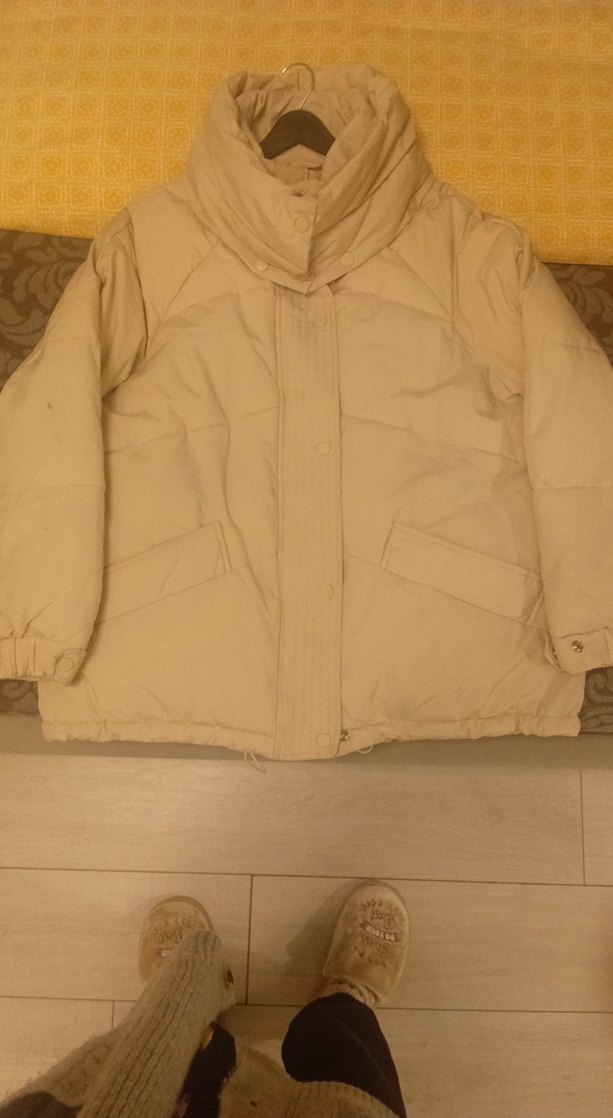 Bej renkli, düğmeli, yüksek yakalı kadın kışlık mont. Yumuşak ve rahat kumaştan, bol kesim ve uzun kolludur. Günlük kullanıma uygundur.