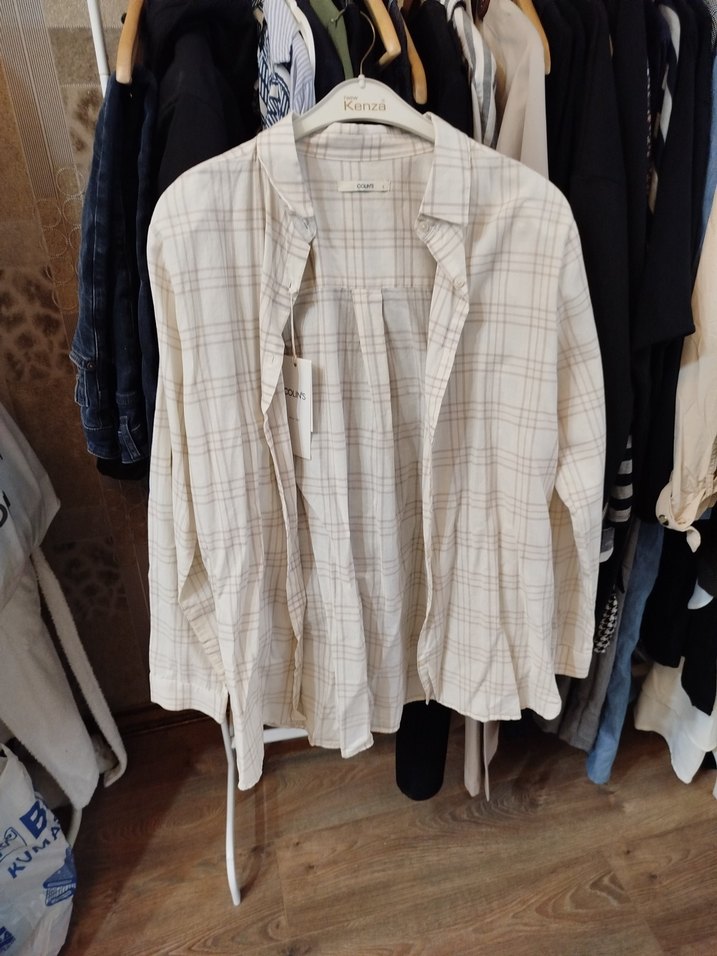Keten kumaştan, düğmeli, uzun kollu, yakalı ve bol kesim bej gömlek. Günlük kullanım için uygun, rahat ve şık bir sokak stili ürünü.