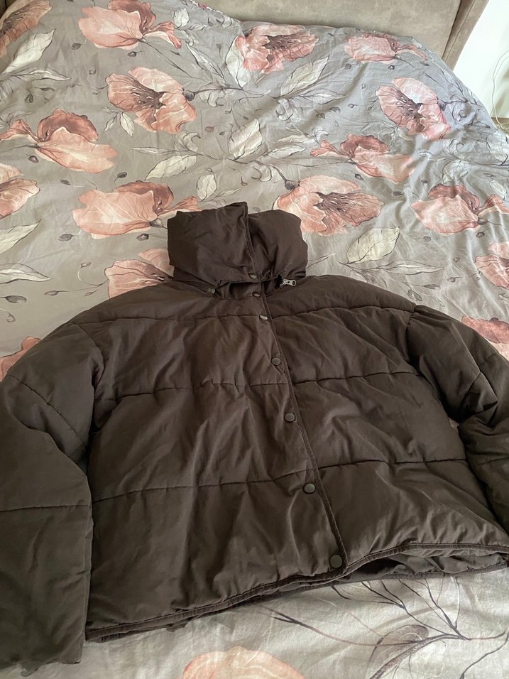 Düğmeli, yüksek yakalı kahverengi midi kışlık mont. Yumuşak ve sıcak kumaştan, bol kesim, günlük sokak stili için uygun. Uzun kollu ve rahat tasarım.