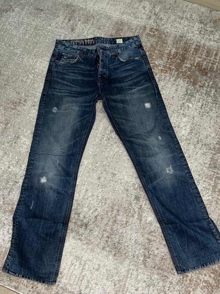 Colin’s Lacivert renkte kot taşlanmış, düğmeli kapamalı, bol kesim erkek denim jean. Dayanıklı kumaştan, günlük kullanım için uygun rahat tarzda. Rahat ragular fit medium rise boot cut