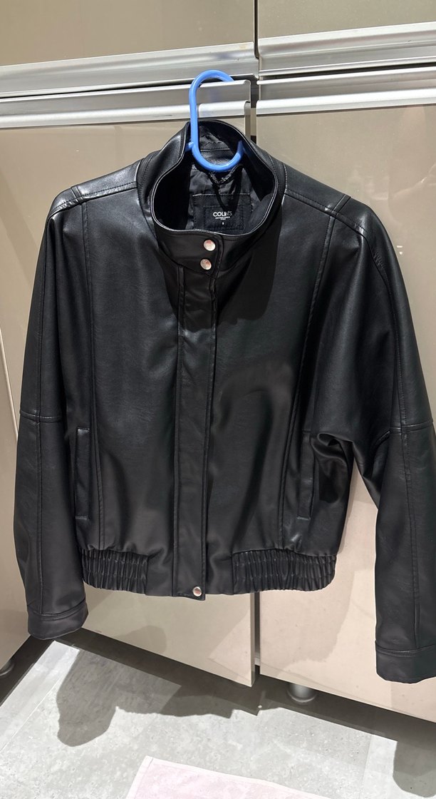 Düğmeli önü ve yüksek yakası olan, uzun kollu, siyah, dar kesim deri ceket. Sokak tarzı ve günlük kullanım için uygundur.