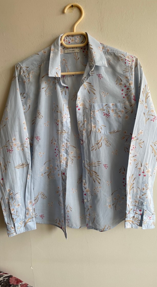 Pamuklu kumaştan, düğmeli ve uzun kollu, bol kesim mavi baskılı bohem kadın gömlek. Günlük kullanım için uygundur. Sayılı kullanılmıştır temiz ve kusursuzdur. İki koltuk altı arası 49 cm boy omuzdan 62 cm