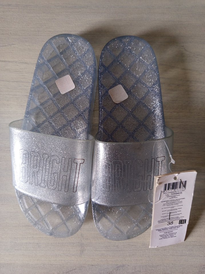Colins marka Gri gümüş renkli 38 numara parlak sim detaylı kadın terlikler. Kauçuk malzemeden üretilmiş, baskılı desenli. Günlük kullanıma uygun, minimalist ve trend tarzda.