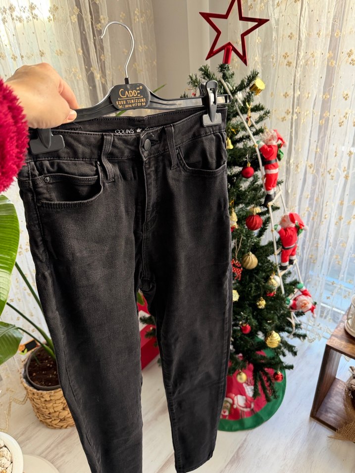 Koyu gri renkte, dar kesim kot pantolon. Günlük sokak stili için uygun, rahat ve trend görünümlü.