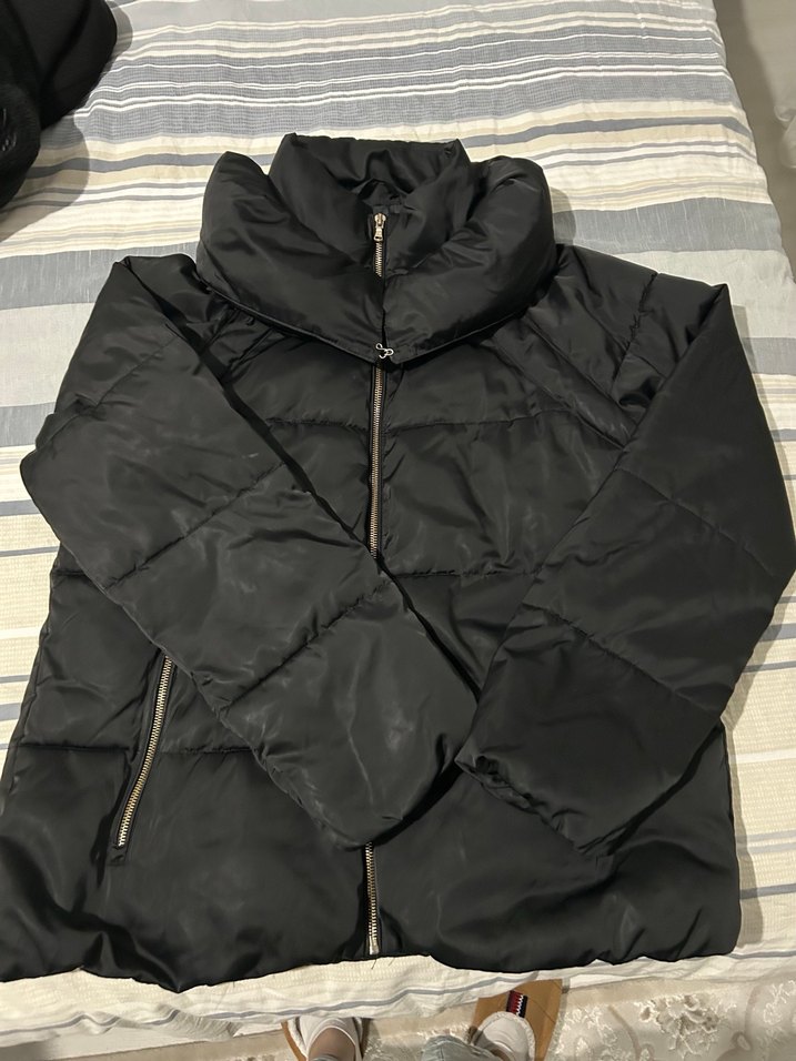 siyah kadın kaban, oturan kesim ve notched yaka ile. Strappy kollu, baskılı desende Colins markası, XL beden. Az kullanıldı bir sorunu yok.