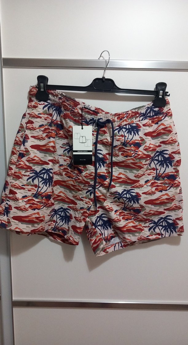 Erkekler için, çok renkli tie-dye desenli, bol kesim mini mayo şort, plaj ve günlük sokak giyimi için uygun.