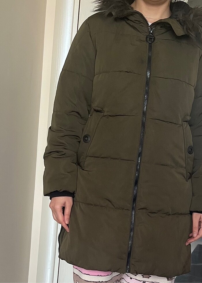 Az kullanılmış temizdir nerfeye sıfır ayarında.. Boyu omuzdan aşağıya 84 cm (diz üstü) , iki koltukaltı arası 51 cm. Yan tarafında genişletmek için açılır kapanır fermuarı var . Şapkası yapışık ama şapkada parçacığı düğmeyle eklenmiş yani istenirse çıkarılabilir. Kol ucu kazak gibi çok hafif tiftik var resimde ekli ama çok rahat temizlelenebileceğini düşünüyorum.