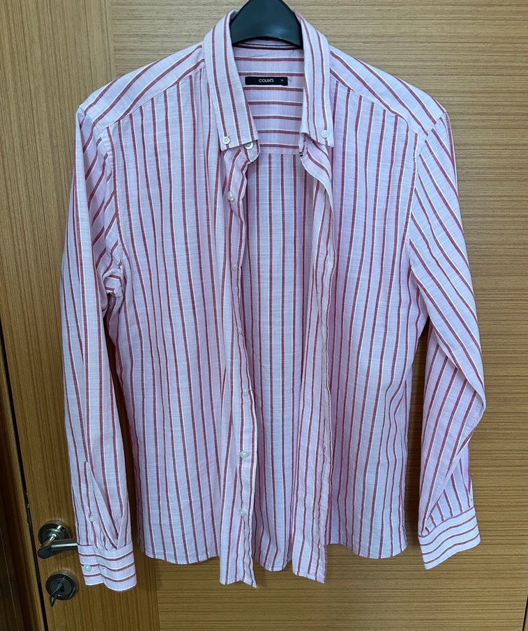 Uzun kollu, yakalı ve düğmeli pamuklu keten erkek gömleği. Normal kesim ve pastel pembe çizgili, ofis ve günlük sokak tarzı için uygundur. Sıfır Xl beden
