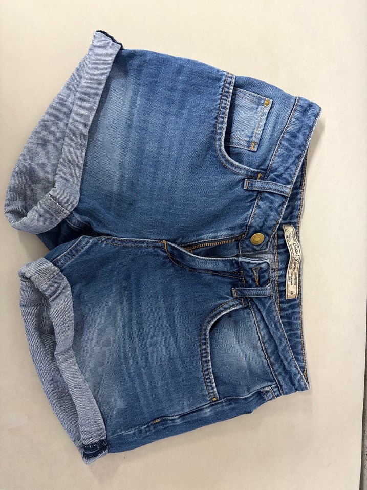 Tokalı detaylı, gri mavi tonlarında, bol kesim kısa kadın denim şort, günlük sokak stiline uygun.
