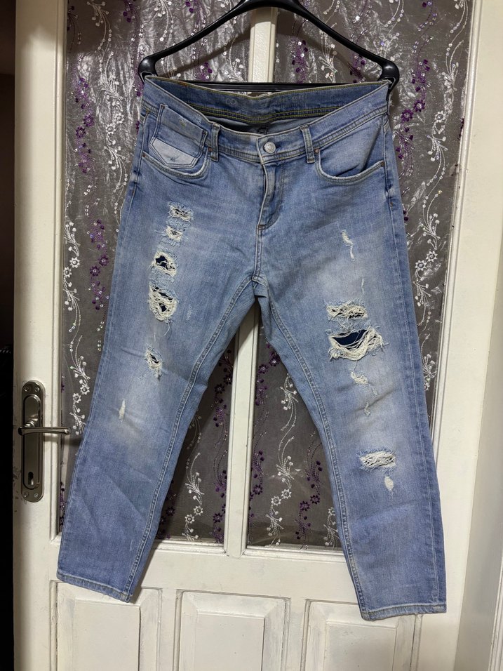 Gevşek kesim, yırtık detaylı mavi kadın kot pantolon. Tokalı tasarıma sahip, günlük ve sokak stiline uygun.