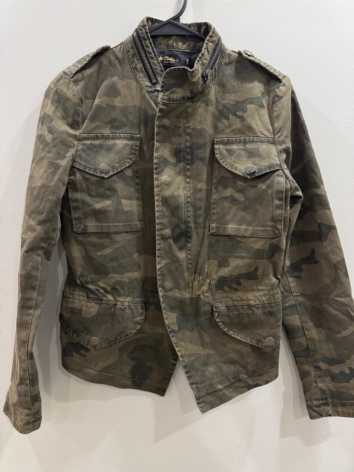 Düğmeli, kamuflaj desenli kahverengi denim ceket. Notlu yaka, uzun kollu ve cep detaylı, şık ve rahat bir sokak stili için uygun. Tertemizdir defosu yok.