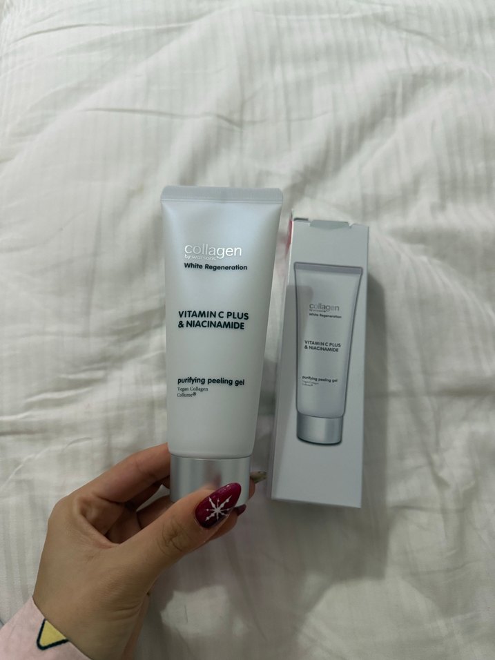 Collagen White Regeneration Vitamin C Plus ve Niacinamide içeren arındırıcı peeling jeli, cildi temizler ve yeniler. Yüz bakımı için uygun.